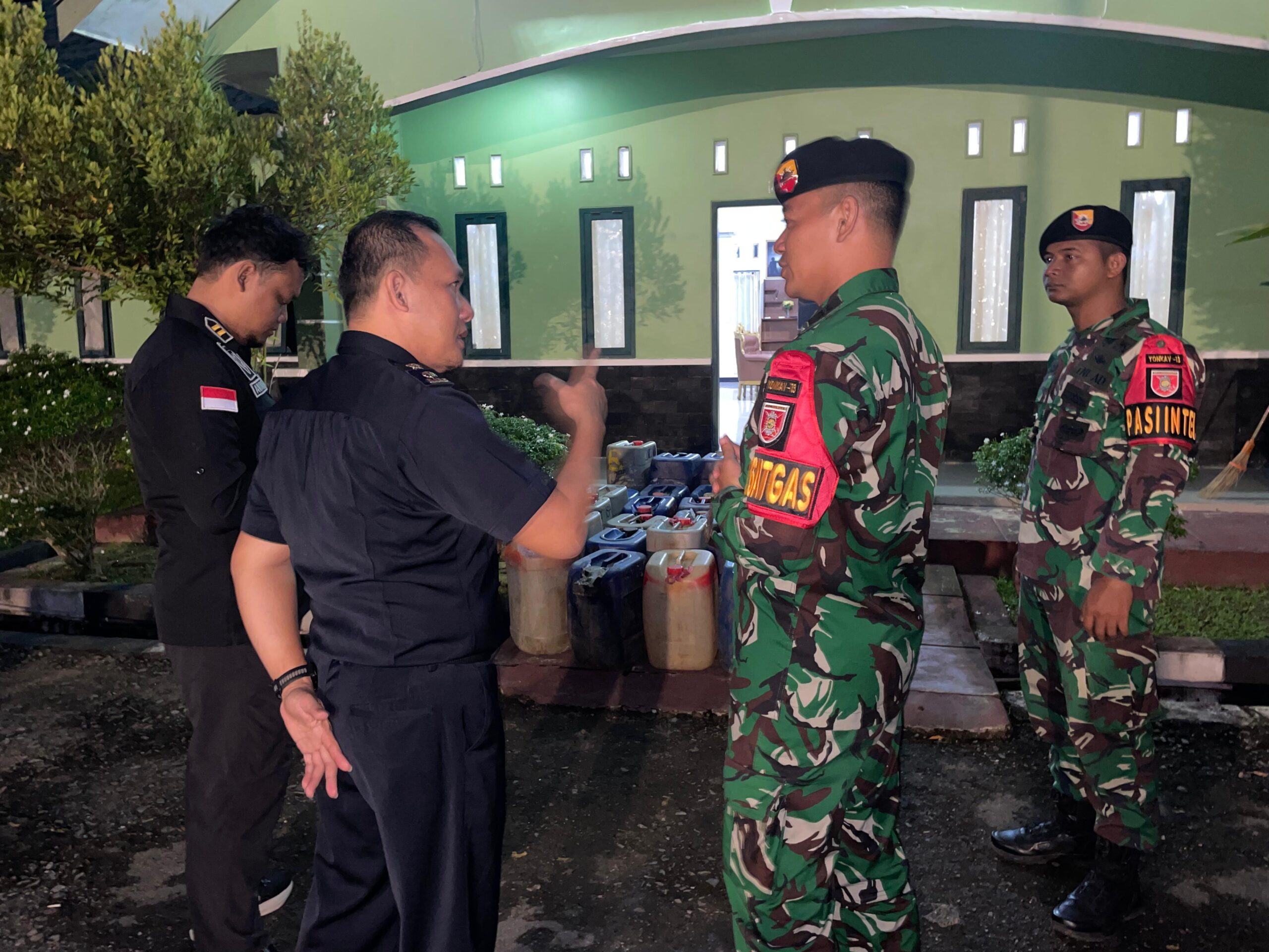 Kecurigaan aparat yang sedang berpatroli akhirnya terbukti. Prajurit TNI mendapati puluhan jerigen bensin siap diangkut.